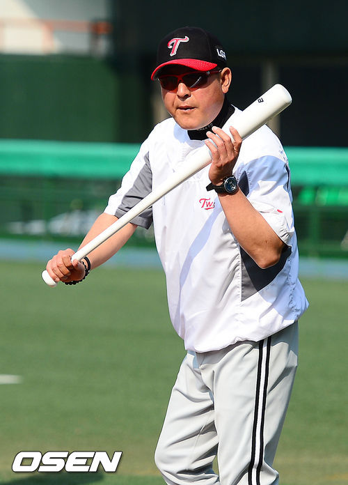 6일 오후 목동구장에서 2013 한국야쿠르트 세븐프로야구 넥센 히어로즈와 LG 트윈스의 경기가 열릴 예정인 가운데, 훈련시간에 LG 김기태 감독이 배트를 들고 스윙을 하고 있다.
