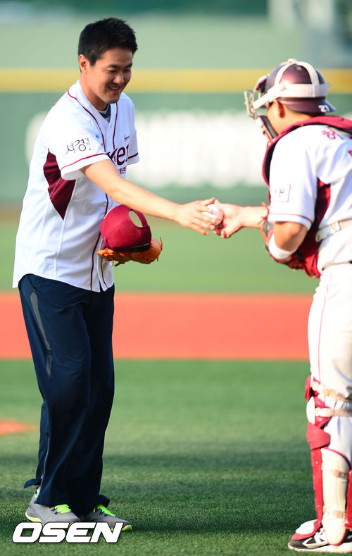 6일 오후 목동구장에서 열린 2013 한국야쿠르트 세븐프로야구 넥센 히어로즈와 LG 트윈스의 경기, 남자농구 오리온스의 김병철(40) 코치가 시구를 한 후 허도환에게 시구볼을 받고 있다.