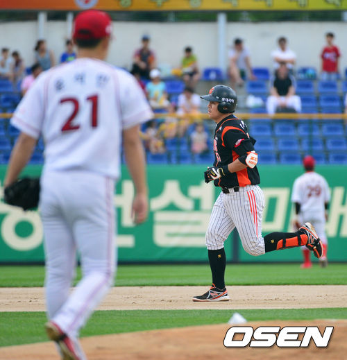 6일 오후 광주 무등경기장에서 '2013 한국야쿠르트 세븐 프로야구' KIA 타이거즈와 롯데 자이언츠의 경기가 열렸다. 1회초 롯데 공격 무사 1, 3루 상황 4번타자 강민호가 KIA 선발 윤석민을 상대로 중월 3점포를 날리고 그라운드를 돌고 있다.
