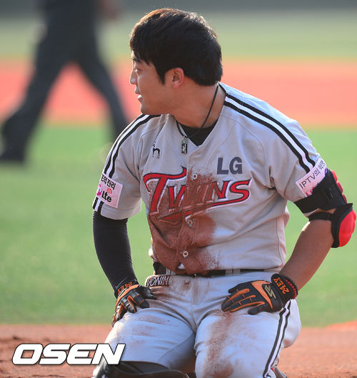 6일 오후 목동구장에서 열린 2013 한국야쿠르트 세븐프로야구 넥센 히어로즈와 LG 트윈스의 경기,1회 초 2사 1루에서 LG 정의윤이 중전안타를 친 후 1루에서 오버런을 하는 바람에 태그아웃 된 후 아쉬워하고 있다.