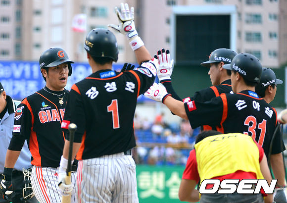 6일 오후 광주 무등경기장에서 '2013 한국야쿠르트 세븐 프로야구' KIA 타이거즈와 롯데 자이언츠의 경기가 열렸다. 1회초 롯데 공격 무사 1, 3루 상황 4번타자 강민호가 KIA 선발 윤석민을 상대로 중월 3점포를 날리고 장성호, 이승화 등과 인사를 나누고 있다.
