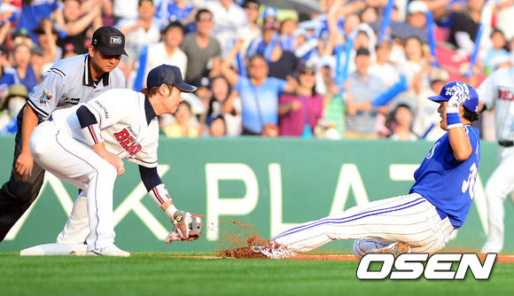 6일 오후 서울 잠실구장에서 열린 '2013 한국야쿠르트 세븐 프로야구' 두산 베어스와 삼성 라이온즈의 경기 2회초 선두타자 이승엽이 우익수 오른쪽 2루타를 치고 3루까지 쇄도하다 아웃당하고 있다.