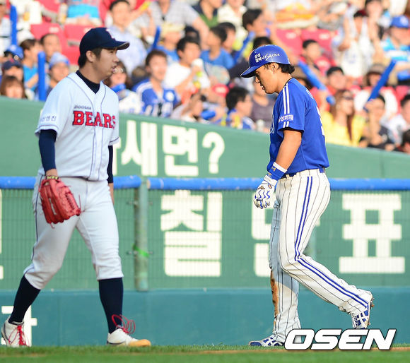 6일 오후 서울 잠실구장에서 열린 '2013 한국야쿠르트 세븐 프로야구' 두산 베어스와 삼성 라이온즈의 경기 2회초 선두타자 이승엽이 우익수 오른쪽 2루타를 치고 3루까지 쇄도하다 아웃당하고 덕아웃으로 향하고 있다.