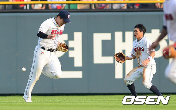 6일 오후 서울 잠실구장에서 열린 '2013 한국야쿠르트 세븐 프로야구' 두산 베어스와 삼성 라이온즈의 경기 2회초 1사 박석민의 뜬공을 김현수와 이종욱이 놓치고 있다.