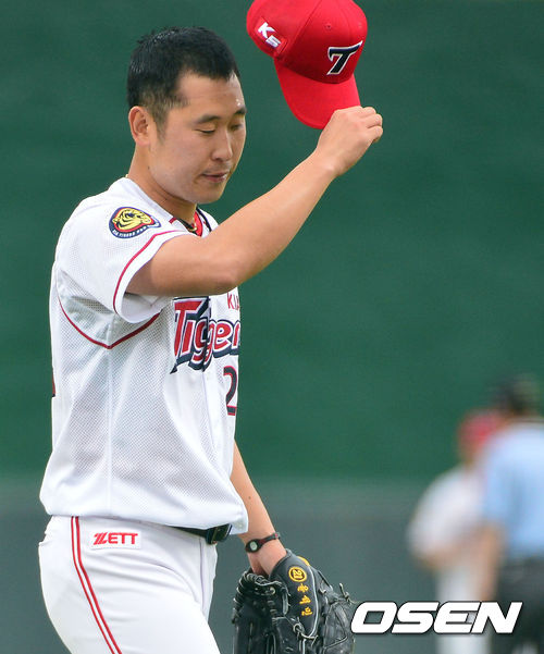 6일 오후 광주 무등경기장에서 '2013 한국야쿠르트 세븐 프로야구' KIA 타이거즈와 롯데 자이언츠의 경기가 열렸다. 1회초 롯데 공격에서 4실점하며 이닝을 마친 KIA 선발 윤석민이 땀을 닦으며 더그아웃으로 들어오고 있다.