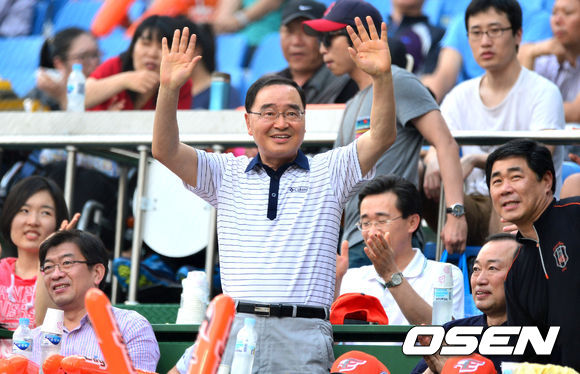 6일 오후 대전구장에서 열린 '2013 한국야쿠르트 세븐 프로야구' 한화 이글스와 SK 와이번스의 경기, 정홍원 국무총리가 대전구장을 방문해 경기를 관전하며 야구팬들에 손을 흔들고 있다.