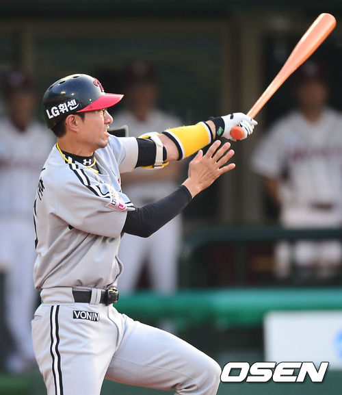 6일 오후 목동구장에서 열린 2013 한국야쿠르트 세븐프로야구 넥센 히어로즈와 LG 트윈스의 경기, 4회초 무사 주자 2루 LG 정성훈이 좌익수 왼쪽 1타점 적시타를 날리고 있다.