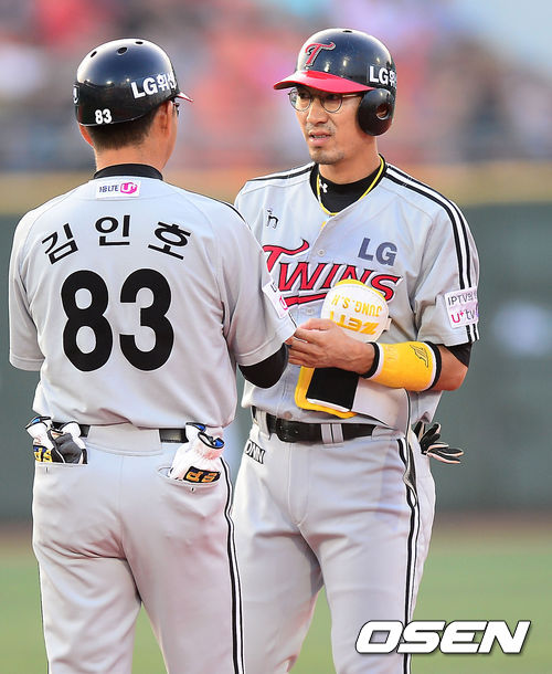 6일 오후 목동구장에서 열린 2013 한국야쿠르트 세븐프로야구 넥센 히어로즈와 LG 트윈스의 경기, 4회초 무사 주자 2루 LG 정성훈이 좌익수 왼쪽 1타점 적시타를 날린 후 2루에서 김인호 코치와 하이파이브를 하고 있다.