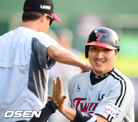 6일 오후 목동구장에서 열린 2013 한국야쿠르트 세븐프로야구 넥센 히어로즈와 LG 트윈스의 경기, 4회초 무사 주자 2루 LG 정성훈의 좌익수 왼쪽 1타점 적시타때 홈을 밟은 이진영이 덕아웃에서 동료들과 하이파이브를 하고 있다.