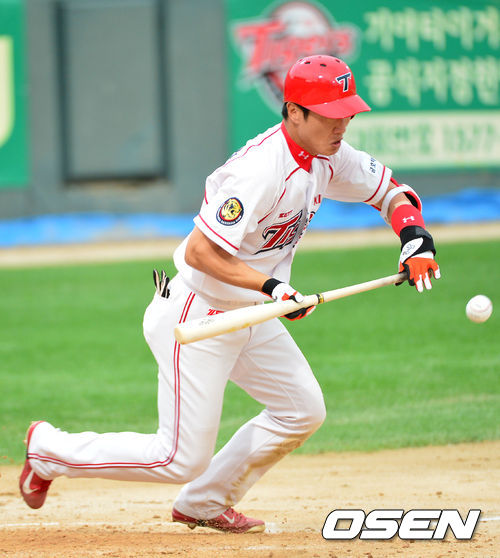 6일 오후 광주 무등경기장에서 '2013 한국야쿠르트 세븐 프로야구' KIA 타이거즈와 롯데 자이언츠의 경기가 열렸다. 3회말 KIA 공격 무사 1, 2루 상황 3번 김주찬이 기습 번트를 시도하고 있다. 롯데 선발 송승준의 송구 실책으로 김주찬은 1루에서 세이프.