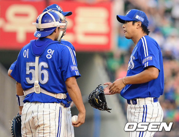 6일 오후 서울 잠실구장에서 열린 '2013 한국야쿠르트 세븐 프로야구' 두산 베어스와 삼성 라이온즈의 경기 5회말 무사 2,3루 정수빈 타석, 윤성환이 투수코치와 이야기를 나누고 있다.