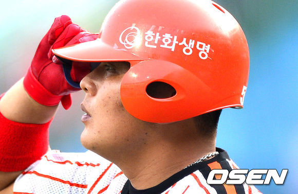 6일 오후 대전구장에서 열린 '2013 한국야쿠르트 세븐 프로야구' 한화 이글스와 SK 와이번스의 경기, 1회말 2사 1루에서 한화 김태균이 헬맷을 고쳐쓰며 타석에 들어서고 있다.