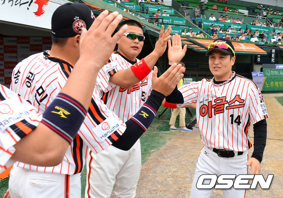 6일 오후 대전구장에서 열린 '2013 한국야쿠르트 세븐 프로야구' 한화 이글스와 SK 와이번스의 경기, 경기에 앞서 한화 이대수가 1000경기 출장 시상식을 마치고 동료선수들과 하이파이브를 하고 있다.