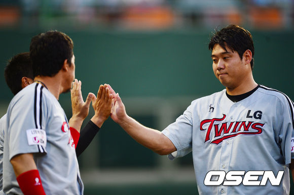 6일 오후 목동구장에서 열린 2013 한국야쿠르트 세븐프로야구 넥센 히어로즈와 LG 트윈스의 경기, 5회말을 마치고 덕아웃으로 들어오는 LG 선발 류제국이 이병규와 하이파이브를 하고 있다.