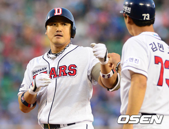 6일 오후 서울 잠실구장에서 열린 '2013 한국야쿠르트 세븐 프로야구' 두산 베어스와 삼성 라이온즈의 경기 5회말 2사 1,2루 홍성흔이 1타점 적시타를 치고 김민재 코치와 하이파이브를 하고 있다.