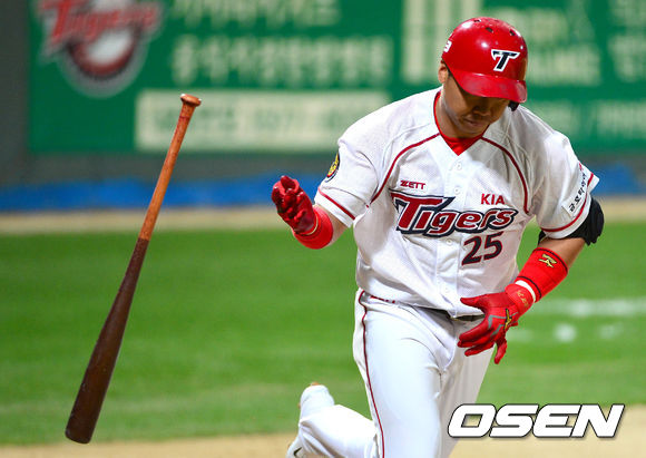 6일 오후 광주 무등경기장에서 '2013 한국야쿠르트 세븐 프로야구' KIA 타이거즈와 롯데 자이언츠의 경기가 열렸다. 6회말 KIA 공격 무사 주자없는 상황 5번타자 이범호가 추격의 좌월 투런포를 터트린 뒤 배트를 던지며 그라운드를 돌고 있다.