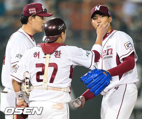 6일 오후 목동구장에서 열린 2013 한국야쿠르트 세븐프로야구 넥센 히어로즈와 LG 트윈스의 경기, 7회초 1사 주자 없는 상황에서 넥센 선발 김영민이 교체되고 있다.