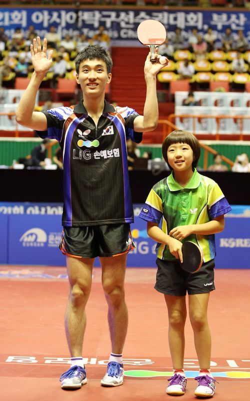 제 21회 아시아탁구선수권대회가 열리고 있는 부산 사직체육관에서 신유빈 양과 이상수, 이호윤(7) 군과 정영식(KDB대우증권)의 시범경기가 열렸다. 남자 복식과 여자 단식 결승전을 앞두고 열린 이번 시범 경기는 각국 대표팀 선수들의 치열한 승부에 빠져 있던 관중들에게 특별한 재미를 선사했다.