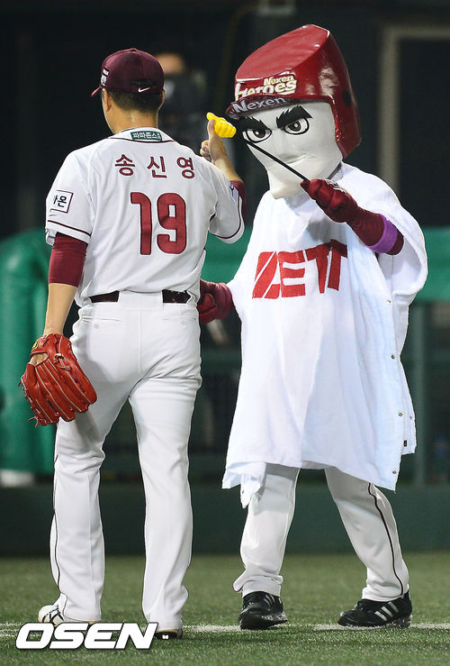 6일 오후 목동구장에서 열린 2013 한국야쿠르트 세븐프로야구 넥센 히어로즈와 LG 트윈스의 경기, 7회초를 마친 넥센 송신영이 턱돌이와 하이파이브를 하고 있다.