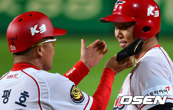 6일 오후 광주 무등경기장에서 '2013 한국야쿠르트 세븐 프로야구' KIA 타이거즈와 롯데 자이언츠의 경기가 열렸다. 7회말 KIA 공격 무사 만루 상황 5번타자 이범호가 역전 2타점 적시 좌전 안타를 날리고 김평호 코치의 축하를 받고 있다.