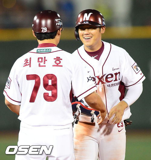 6일 오후 목동구장에서 열린 2013 한국야쿠르트 세븐프로야구 넥센 히어로즈와 LG 트윈스의 경기, 7회말 1사 주자 3루 넥센 문우람이 우익수 오른쪽 1타점 적시타를 날린 후 2루에서 최만호 코치와 하이파이브를 하고 있다.