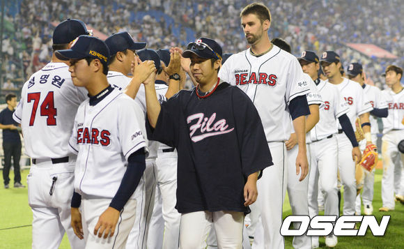 6일 오후 서울 잠실구장에서 열린 '2013 한국야쿠르트 세븐 프로야구' 두산 베어스와 삼성 라이온즈의 경기 종료 후 이종욱을 비롯한 두산 선수들이 하이파이브를 하고 있다.