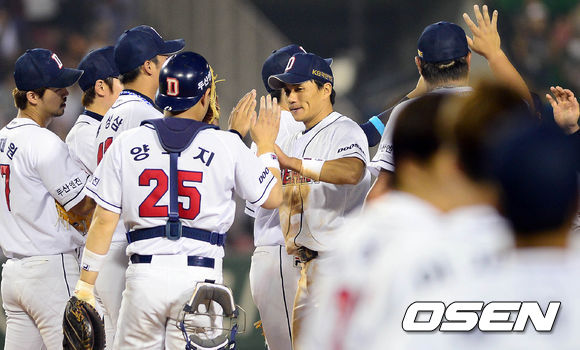 6일 오후 서울 잠실구장에서 열린 '2013 한국야쿠르트 세븐 프로야구' 두산 베어스와 삼성 라이온즈의 경기 종료 후 두산 선수들이 하이파이브를 하고 있다.