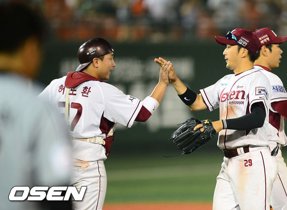 경기를 마치고 이택근이 허도환과 하이파이브를 하고 있다. / rumi@osen.co.kr
