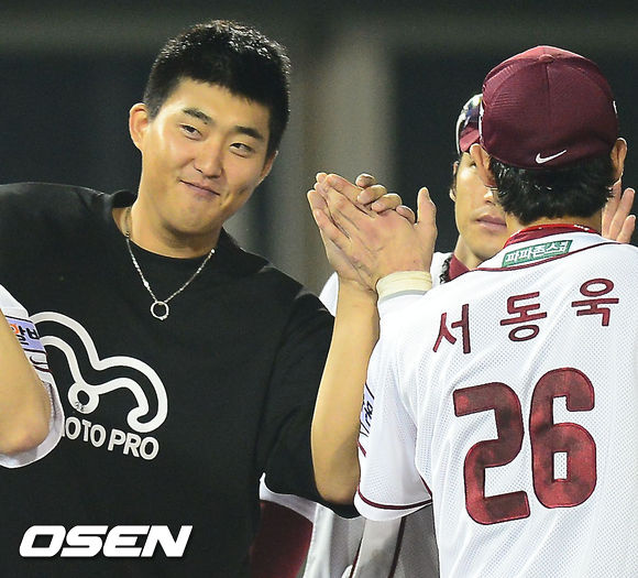 경기를 마치고 승리투수 넥센 김영민이 동료들과 하이파이브를 하고 있다. / rumi@osen.co.kr