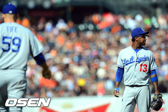 [OSEN=샌프란시스코, 곽영래 기자] 7일(한국시간) 미국 캘리포니아주 샌프란시스코에서 열린 2013 메이저리그 샌프란시스코 자이언츠와 LA 다저스의 경기, 2회말 1사 1,2루 샌프란시스코 크로포드의 내야땅볼때 실책을 범한 다저스 라미레스가 아쉬운 표정을 짓고 있다