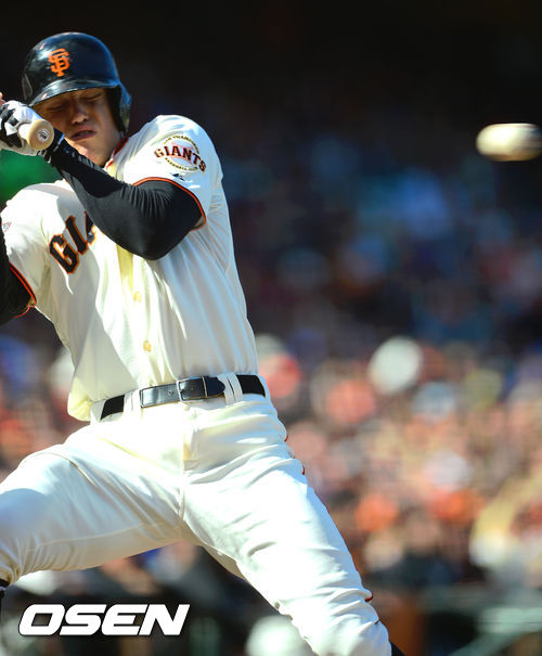 [OSEN=샌프란시스코, 곽영래 기자] 7일(한국시간) 미국 캘리포니아주 샌프란시스코에서 열린 2013 메이저리그 샌프란시스코 자이언츠와 LA 다저스의 경기, 3회말 1사 샌프란시스코 펜스가 다저스 파이프의 몸쪽 가까운 공을 피하고 있다.