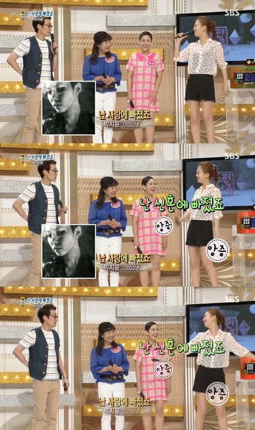 장윤정은 7일 방송된 SBS ‘도전 1000곡’에서 걸그룹 레인보우가 박지윤의 ‘난 사랑에 빠졌죠’를 선곡하자 춤을 추기 시작했다.
