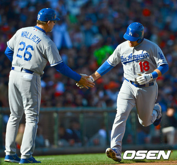 [OSEN=샌프란시스코, 곽영래 기자] 7일(한국시간) 미국 캘리포니아주 샌프란시스코에서 열린 2013 메이저리그 샌프란시스코 자이언츠와 LA 다저스의 경기, 5회초 2사 1루 다저스 페데로위츠가 2점 홈런을 날리고 왈라 코치와 하이파이브를 하고 있다.