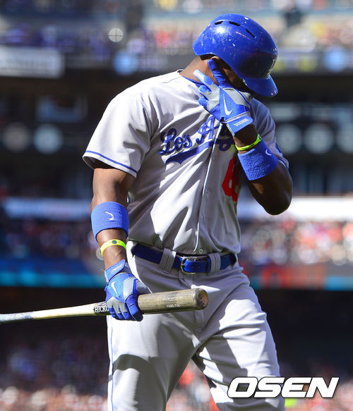 [OSEN=샌프란시스코, 곽영래 기자] 7일(한국시간) 미국 캘리포니아주 샌프란시스코에서 열린 2013 메이저리그 샌프란시스코 자이언츠와 LA 다저스의 경기, 6회초 다저스 선두타자 푸이그가 삼진아웃 당한 뒤 아쉬워하고 있다