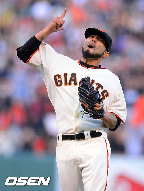 9회말 다저스 공격을 막은 샌프란시스코 로모 마무리 투수가 환호하고 있다./ soul1014@osen.co.kr