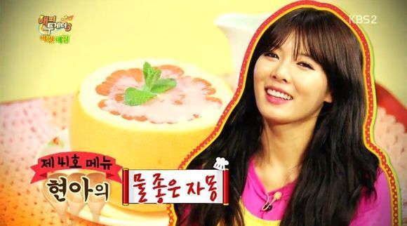 ‘물 좋은 자몽’은 지난 4일 방송된 KBS 2TV ‘해피투게더’ 야간 매점에서 선정된 제41호 야간 메뉴다. 이날 방송에서 현아는 ‘물 좋은 자몽’을 직접 요리해보였다. 자몽을 잘라 가장자리에 칼집을 낸 뒤 연유를 뿌리면 된다.