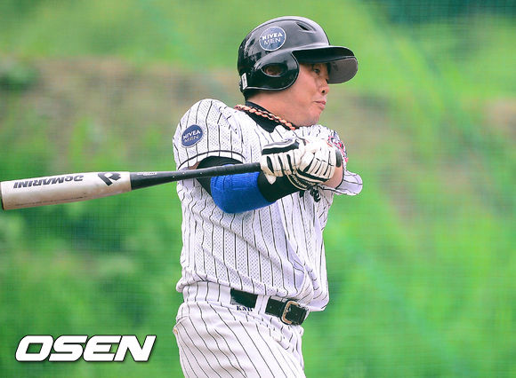 7일 오후 경기도 양평 야구장에서 열린 '제4회 니베아 맨 컵 전국생활체육 야구대회' 우주인야구단과 백화이어의 경기, 1회초 무사 주자 만루 백화이어 이보국 선취 1타점 적시타를 날리고 있다.