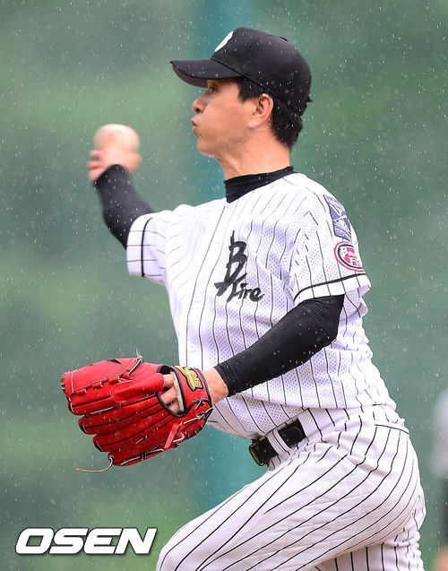7일 오후 경기도 양평 야구장에서 열린 '제4회 니베아 맨 컵 전국생활체육 야구대회' 우주인야구단과 백화이어의 경기, 백화이어 선발 이광재가 힘차게 공을 뿌리고 있다.