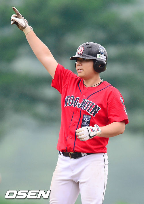 7일 오후 경기도 양평 야구장에서 열린 '제4회 니베아 맨 컵 전국생활체육 야구대회' 우주인야구단과 백화이어의 경기, 4회말 2사 주자 만루 우주인야구단 김종찬이 3타점 주자 싹쓸이 적시타를 날린 후 2루에서 기뻐하고 있다.