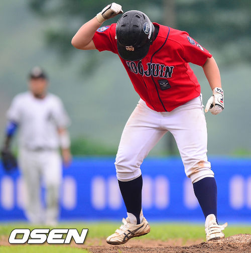 7일 오후 경기도 양평 야구장에서 열린 '제4회 니베아 맨 컵 전국생활체육 야구대회' 우주인야구단과 백화이어의 경기, 4회말 2사 주자 만루 우주인야구단 김종찬이 3타점 주자 싹쓸이 적시타를 날린 후 2루에서 기뻐하고 있다.