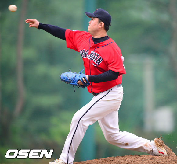 7일 오후 경기도 양평 야구장에서 열린 '제4회 니베아 맨 컵 전국생활체육 야구대회' 우주인야구단과 백화이어의 경기, 우주인야구단 선발 황규평이 힘차게 공을 뿌리고 있다.