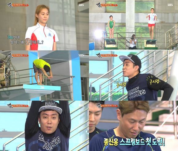 이날 멤버들은 코치의 지시에 따라 3m, 5m 높이에서 머리부터 입수하는 헤드다이빙 방법을 연마한 가운데, 강호동, 유이, 윤세윤 등 '몸치' 멤버들의 고통스러운 신음소리가 이어졌다.