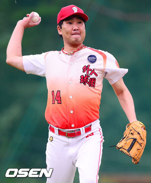 7일 오후 경기도 양평 야구장에서 열린 '제4회 니베아 맨 컵 전국생활체육 야구대회' 외인구단과 살세로스 경기, 1회 2사 주자 1,2루 살세로스 나준호의 투수 앞 땅볼 때 외인구단 선발 구병무가 1루로 송구하며 아웃 시키고 있다.