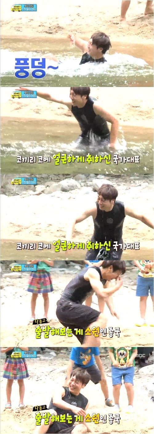 축구선수 출신 송종국이 코끼리코를 하고 도는 게임에서 맥을 추지 못하면서 구멍으로 등극했다.