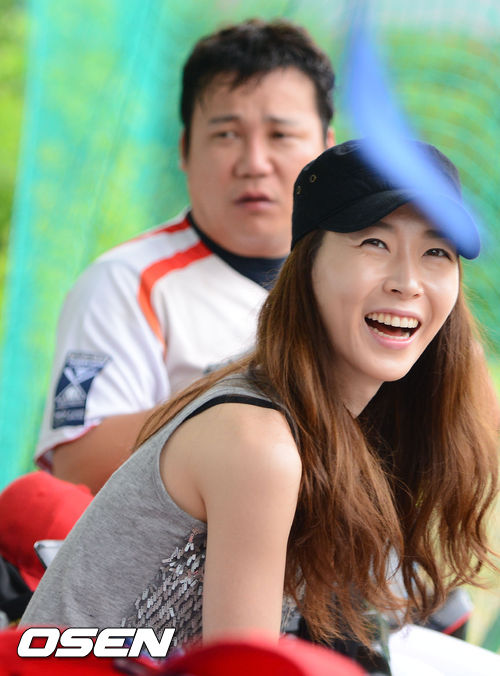 7일 오후 경기도 양평 야구장에서 열린 '제4회 니베아 맨 컵 전국생활체육 야구대회' 외인구단과 살세로스 경기, 외인구단의 김현철이 덕아웃에서 말을 하자 아내 최은경씨가 환하게 웃고 있다.