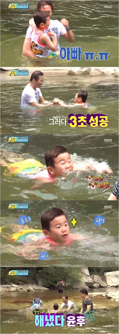 또 아이들과 아빠들은 계곡 물에서 물미끄럼틀, 다이빙 등을 즐겼고 윤후는 수영배우기로 재미있는 시간을 보냈다.