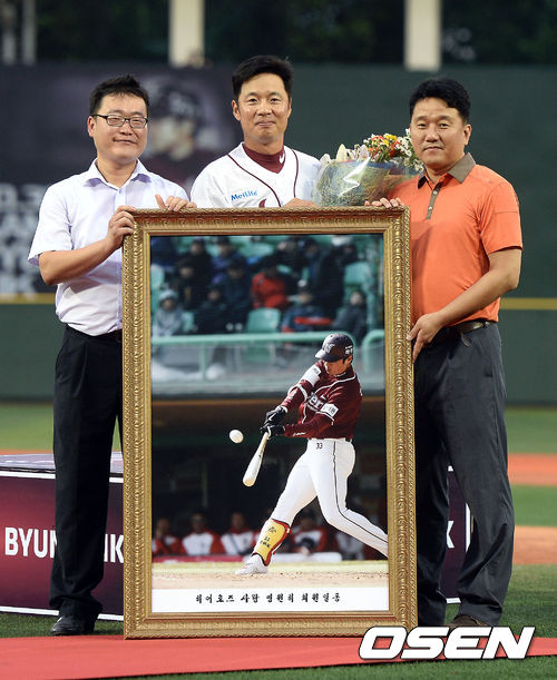 7일 오후 서울 목동 야구장에서 열린 '2013 한국야쿠르트 세븐 프로야구' 넥센 히어로즈와 LG 트윈스의 경기에 앞서 진행된 강병식 코치 은퇴기념 행사에서 강병식 코치가 팬들에게 대형액자를 선물받은 뒤 기념촬영을 하고 있다.
