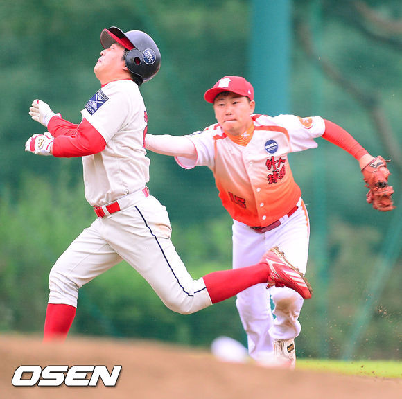 7일 오후 경기도 양평 야구장에서 열린 '제4회 니베아 맨 컵 전국생활체육 야구대회' 외인구단과 살세로스 경기, 4회말 2사 2,3루에서 살세로스의 최보원 3루수 땅볼을 잡아서 외인구단 3루수 한선찬이 잡아서 주자를 태그아웃 시키고 있다.