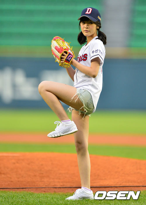 7일 오후 서울 잠실야구장에서 열린 '2013 한국야쿠르트 세븐 프로야구' 두산 베어스와 삼성 라이온즈의 경기, 경기에 앞서 중국 아역배우 서교가 시구를 하고 있다.