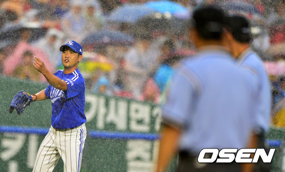 7일 오후 서울 잠실야구장에서 열린 '2013 한국야쿠르트 세븐 프로야구' 두산 베어스와 삼성 라이온즈의 경기, 1회말 2사 2루에서 우천으로 경기가 중단되자 삼성 선발 장원삼이 심판에 공을 건네고 있다.